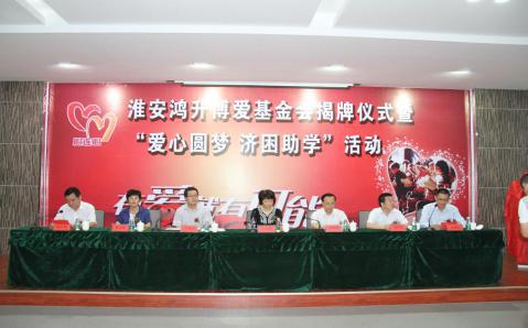 7月1日下午,淮安鸿升博爱基金会揭牌仪式暨“爱心圆梦、济困助学”活动在江苏鸿升集团三楼大讲堂隆重举行。淮安市副市长王红红和淮安经济技术开发区副主任、综合保税区主任、党组书记刘晓录为基金会揭牌。淮安鸿升博爱基金会理事长徐长颂主持活动。淮安市民政局副书记、副局长关晓卫,民盟淮安市委副主委朱伊帆,民盟淮安市委秘书长朱春霞,淮安市高级职业技术学校副校长冀益萍等出席活动。