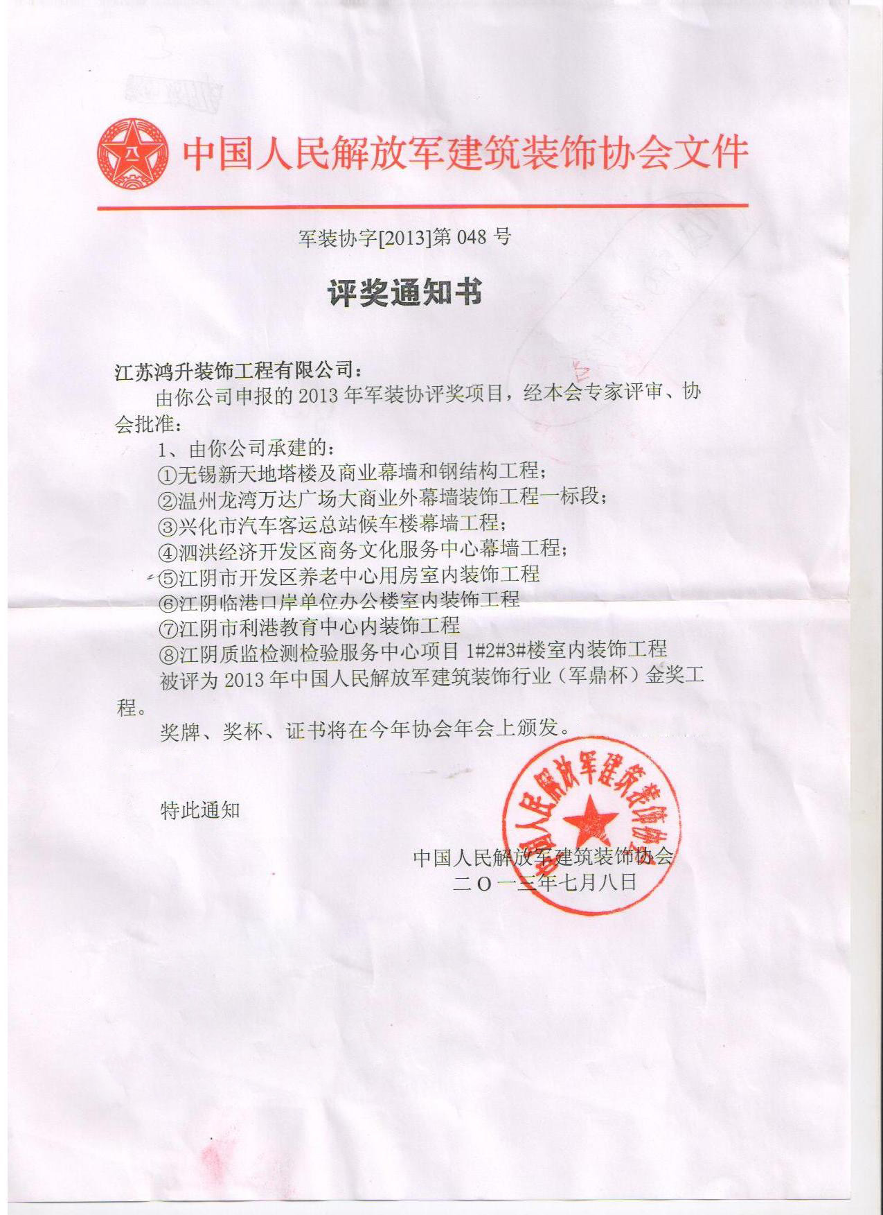 热烈祝贺我司温州龙湾万达大商业幕墙项目、泗洪经济开发区商务文化中心幕墙项目等八个项目获得解放军军鼎杯金奖。