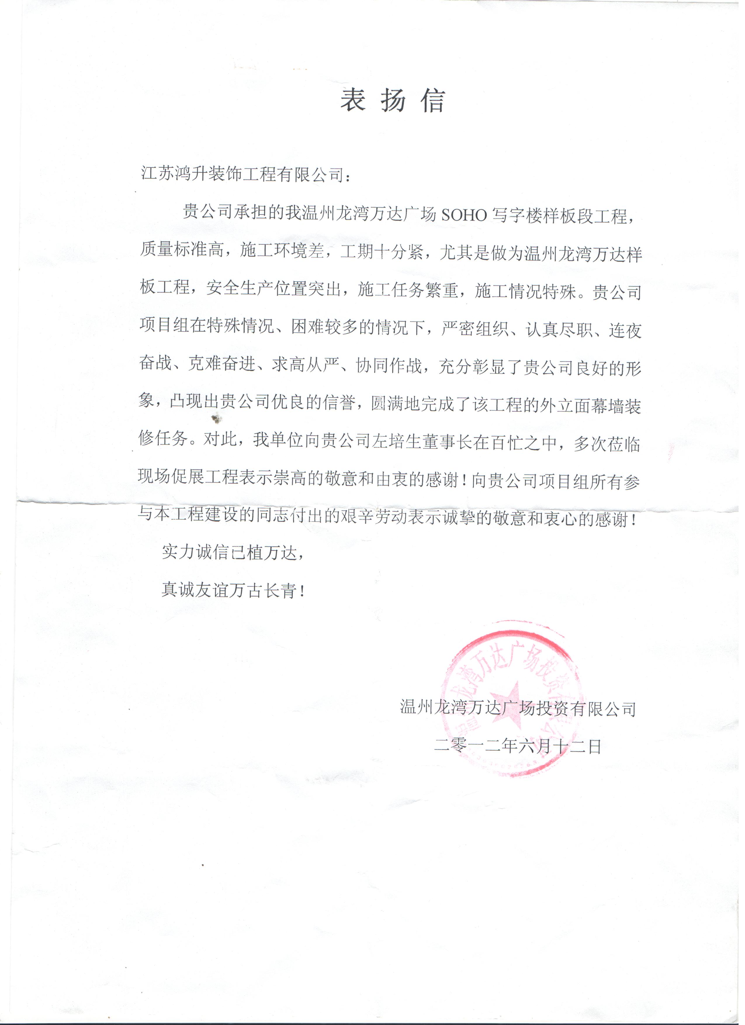 日期:2012-07-03对于我司在温州龙湾万达广场施工过程中的优异表现,业主方温州龙湾万达广场投资有限公司近日我对司进行了公开表彰,对我司在质量标准高、施工环境差、工期十分紧等各种恶劣环境下克服重重困难,按时圆满的完成指定任务给予高度赞扬,且对我司的企业精神品质、优良作风和优质信誉及文化素养给予了高度评价。 -